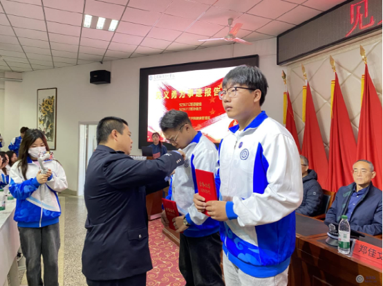 青山区公安分局青山路派出所教导员郑佳文警官为两位同学颁发了“青山义警”聘书与纪念章。
