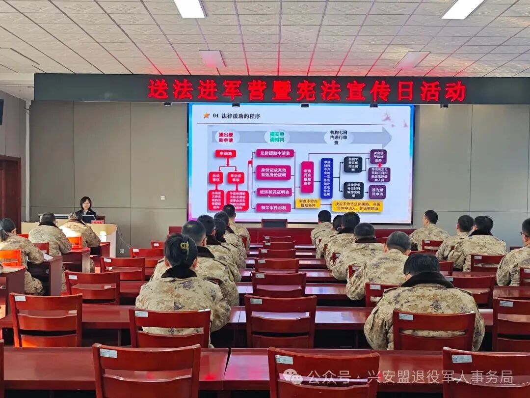 在第十二个国家宪法日来临之际,为深入学习贯彻习近平法治思想,进一步提升官兵法治素养和依法维权能力,乌兰浩特市退役军人事务局联合市司法局,邀请专业法律援助律师走进驻乌部队,开展送法进军营暨宪法宣传日主题活动。
